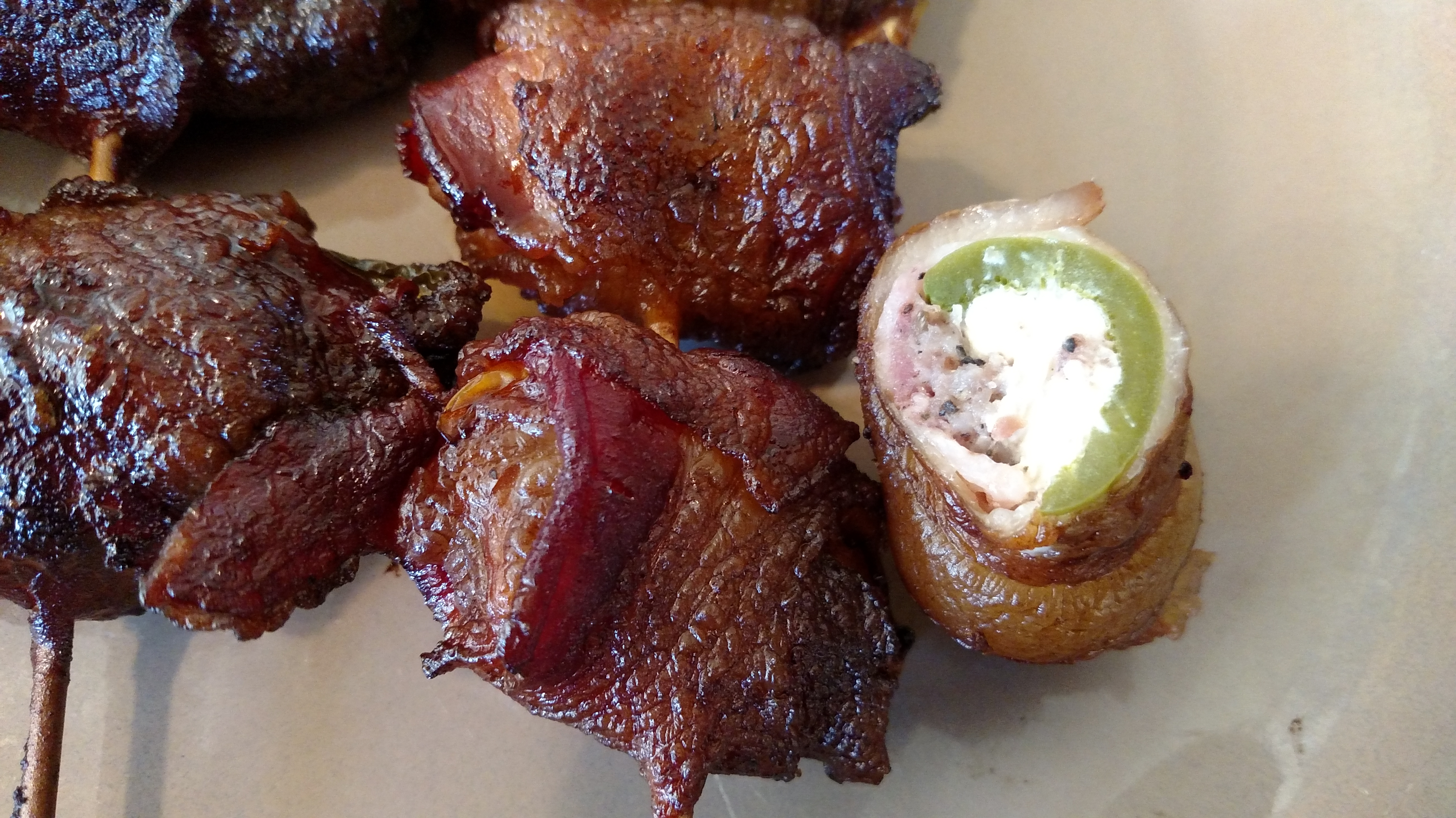 - Wrap a slice of bacon around each pepper half to hold the filling in, then skewer