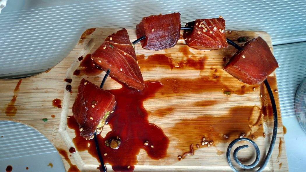 - Mix all marinade ingredients and add tuna. Allow tuna to marinate for 30 minutes to an hour.